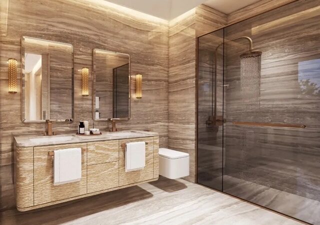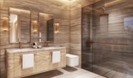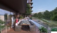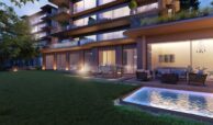 The apartments, available in 2, 4, and 5-bedroom configurations, include a living room, bathroom, en-suite bathroom, laundry room, and balcony. Some apartments even offer private gardens. Each apartment is equipped with smart home technology, air conditioning, stylish interior doors, underfloor heating, natural marble surfaces, laminated parquet flooring, and shower cabins.