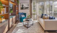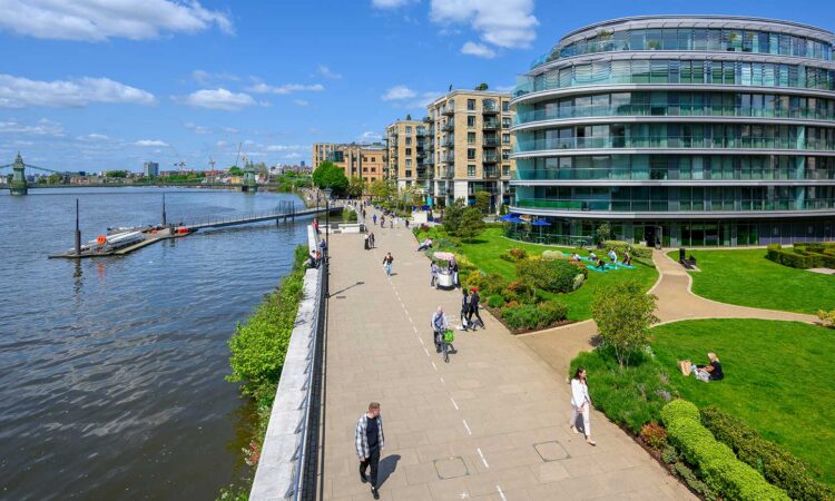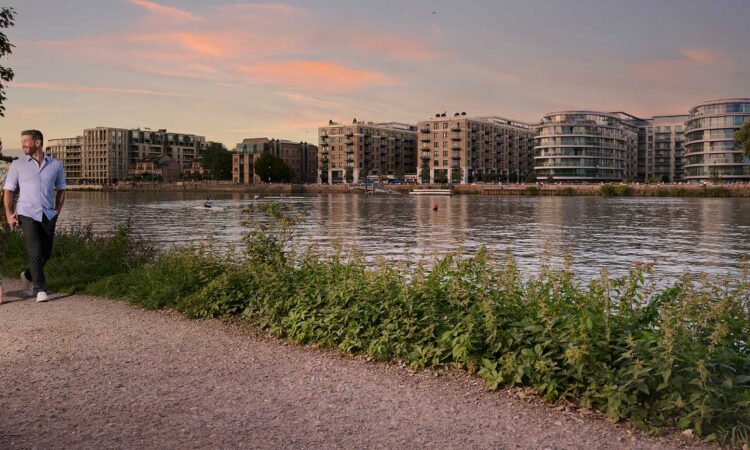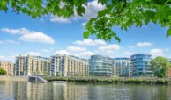 A private balcony offers a tranquil outdoor retreat with views of the surrounding landscaped gardens and Fulham’s charming streetscape. Floor-to-ceiling windows throughout the apartment flood the interiors with natural light, creating a bright and welcoming atmosphere.