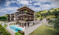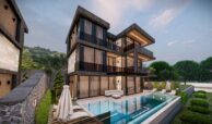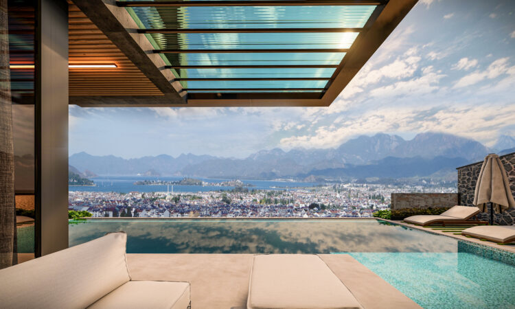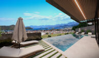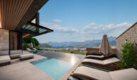 Inside, the villas offer a 13 m² open-plan kitchen and a 50 m² living area that is bright and airy, along with an elevator, cloakroom area, and guest restroom on the ground floor. The basement features a heated indoor pool (25 m²), a Turkish bath, sauna, fitness area, laundry room, and a luxurious bedroom with an en-suite bathroom, jacuzzi, and dressing area. The first floor includes two bedrooms with en-suite bathrooms, dressing rooms, and private balconies. The roof floor has two additional bedrooms with en-suite bathrooms, jacuzzis, dressing areas, and balconies, offering spectacular views.