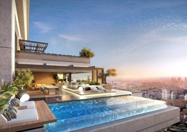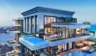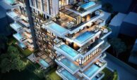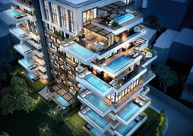 The project spans 60,000 m² and consists of 5 blocks, each with 10 stories, offering 160 apartments ranging from 86 m² to 767 m². The development boasts a variety of high-end facilities including 24/7 reception, concierge services, valet parking, technical and emergency services, cleaning services, mail rooms, sun terraces, staff rooms, landscaped areas, a meeting room, indoor parking, an outdoor swimming pool, a children’s playground, and 24/7 security with camera surveillance.