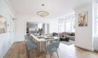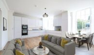 Upon entering the apartment, you are greeted by an open plan living and dining area that flows effortlessly into a designer kitchen. Large windows frame the room with daylight and allow views of landscaped parkland beyond, creating a calm and inviting atmosphere. The kitchen features integrated appliances, crisp cabinetry, and elegant finishes that invite cooking, entertaining or simply relaxing. The living space gives enough room for distinct zones: a comfortable seating area, dining table and even a home-office nook.