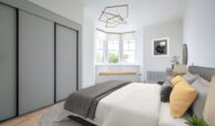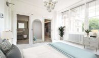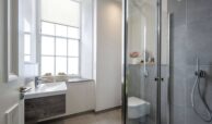 The bedroom serves as a tranquil retreat, with room for a king-sized bed, built-in storage and space for a seating area. Elegant finishes punctuate the en-suite bathroom, where contemporary tiling and quality fixtures combine form and function. Underfloor heating, high-performance glazing and sustainable design make the home comfortable year-round. The refined interior is balanced by the building’s heritage features—stone walls, high ceilings and original architectural details add character and elegance.