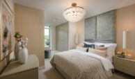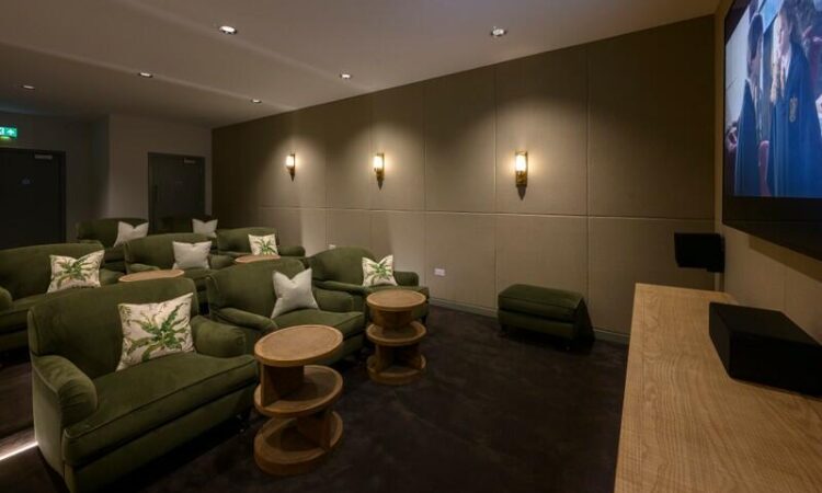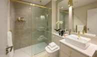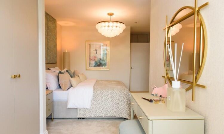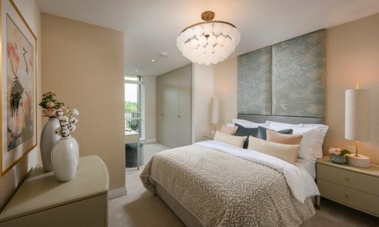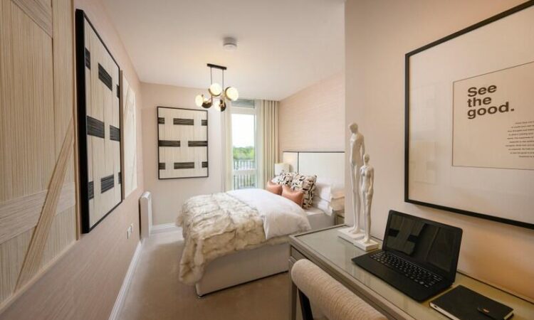 The principal bedroom includes a dressing area with fitted wardrobes and a sleek en-suite, while the second bedroom offers generous space and views of landscaped gardens. Additional features include a versatile hallway with storage, underground allocated parking, and access to residents-only amenities like a cinema room, gym, co-working spaces, and padel courts.