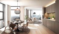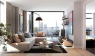 The apartment spans approximately 1,254 sq ft of thoughtfully designed living space, positioned on the 26th floor with dual south and west-facing aspects. Its open-plan layout maximizes natural light, with floor-to-ceiling windows framing panoramic views across London’s skyline — including St. Paul’s Cathedral and the city beyond. Two private balconies provide outdoor spaces ideal for relaxing or entertaining while enjoying the spectacular sunsets over South London.