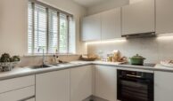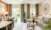 The ground floor features a sleek open-plan kitchen with Bosch appliances, laminate worktops, and feature LED lighting. The spacious living and dining area is filled with natural light from patio doors leading directly to the private garden—perfect for entertaining or enjoying quiet family evenings.
