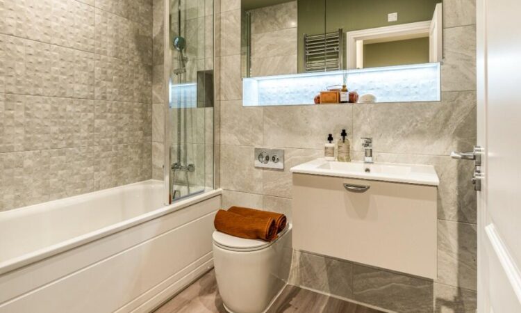 Upstairs, the master bedroom includes a fitted wardrobe and a modern en-suite bathroom with high-quality finishes. Two additional bedrooms share a stylish family bathroom equipped with a bathtub and chrome fixtures. Underfloor heating on the ground floor and a gas central heating system ensure year-round comfort.