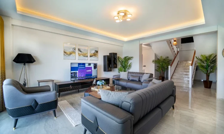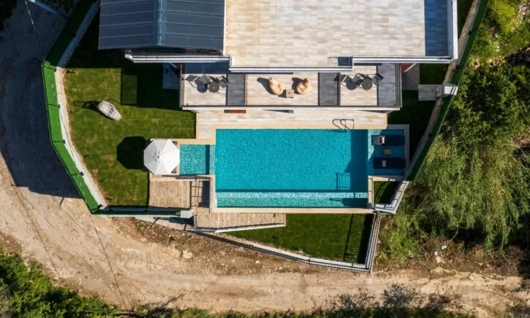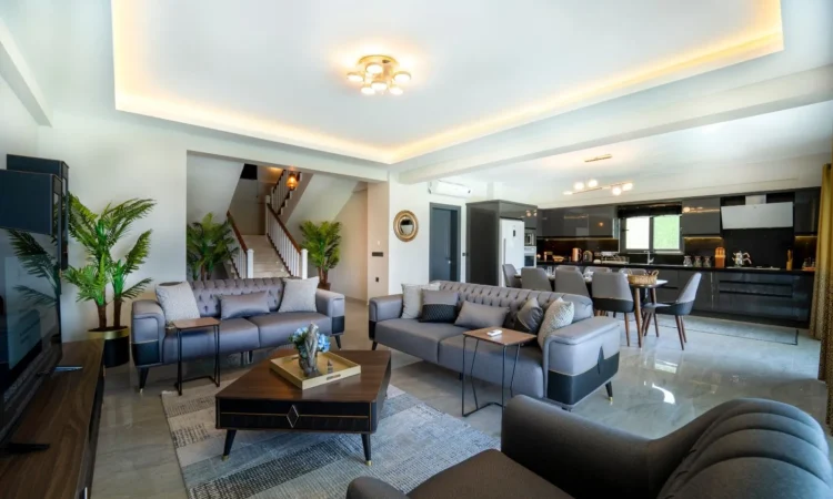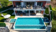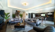Set on a 650 m² plot, the villa is surrounded by pine trees and offers a private, tranquil retreat. The property features a net interior area of 240 m² and is designed to ensure complete privacy with elevated garden walls. The outdoor area includes a spacious terrace with seating and sunbathing areas, alongside a beautifully designed outdoor pool.