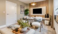 The ground floor welcomes you with a spacious open-plan kitchen and dining area, complete with integrated appliances, sleek stone worktops, and elegant glass splashbacks. Floor-to-ceiling patio doors lead seamlessly to the landscaped back garden, ideal for entertaining or family gatherings. A separate living room and a private study provide flexible spaces for relaxation and working from home.