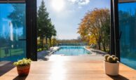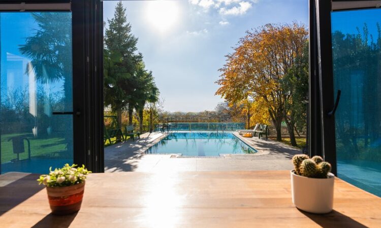 The single-floor pool house offers two showers, two bathrooms, and a separate kitchen.