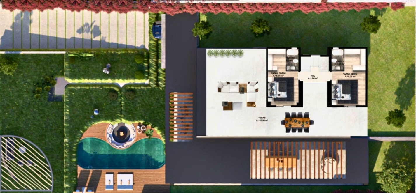 The detached houses for sale in Bodrum are conveniently located near daily amenities such as cafes, restaurants, markets, and pharmacies. The property is only 350 m from the beach, 7 km from Yalıkavak Marina, 16 km from Bodrum State Hospital, and 56 km from Bodrum-Milas Airport, ensuring easy access to everything you need.