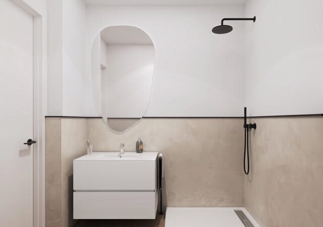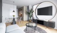 The apartments feature either two or three spacious bedrooms, with the master bedroom offering a private en-suite bathroom equipped with a walk-in shower, ensuring both convenience and privacy. A second bathroom, also featuring a walk-in shower, provides additional comfort. The heart of the home is the open-plan kitchen and dining area, providing a modern space for cooking and enjoying meals with family and friends. The expansive living area is bathed in natural light, thanks to large French-style windows that lead out to a sun terrace, offering the perfect spot to enjoy the Mediterranean climate.