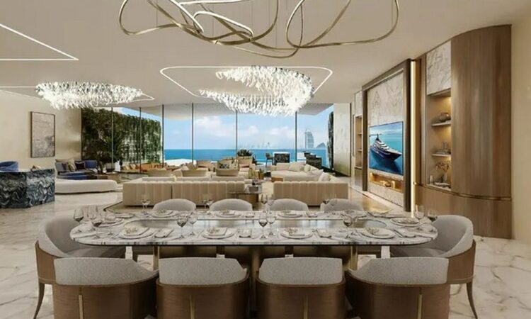 This impressive six-bedroom sky palace is gloriously perched on the top floor of One Crescent, Palm Jumeirah, and offers panoramic views of Palm Jumeirah, the open sea, and the city skyline. Its the perfect option for those wishing to experience a premium lifestyle in one of the most desirable locations in Dubai.