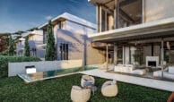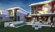 The spacious five-bedroom villas feature a living room, a separate or open-plan kitchen, an entrance hall, a WC, a winter garden, 3 en-suite bathrooms, a dressing room, a laundry-ironing room, and a terrace. Additional features include air conditioning in every room, internet infrastructure, a shower cabin, a built-in kitchen, electric blinds, satellite TV infrastructure, underfloor heating, a hobby garden, a heat pump, a dishwasher, a microwave, and storage space.