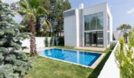 Each villa in this exclusive complex offers a private garden and a 3-bedroom loft-style layout. Enjoy your own private swimming pool, parking space, and added security with cameras. The interior features an open-plan kitchen, en-suite bathroom, shower cabin, fireplace, and terrace. Additionally, the villas come equipped with a smart home system, satellite TV system, PVC windows, and a steel door for added security.