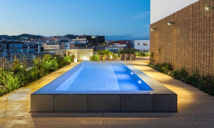 The building itself combines beautiful neoclassical architecture with contemporary modern amenities. The residence features a rooftop swimming pool with panoramic views, a communal terrace for relaxation, and elevator access to all floors.
