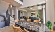 - Ground Floor: Features a spacious open-plan kitchen and living room. The modern kitchen is equipped with high-quality appliances, including a refrigerator, dishwasher, oven, and built-in stove, along with a dining table for four. The living room includes a seating area, TV, air conditioning, fireplace, and direct access to the pool terrace.