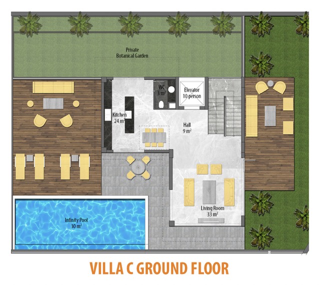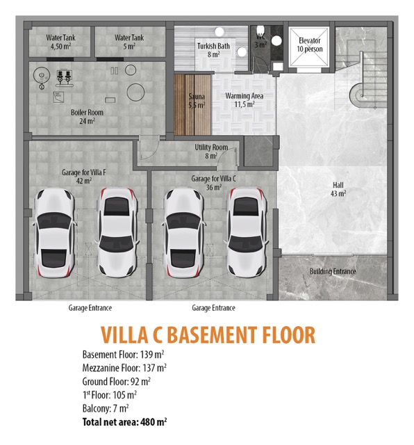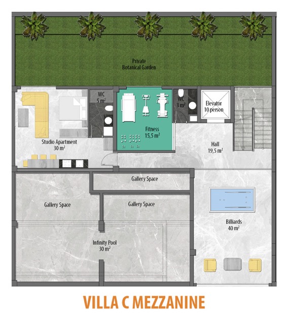 Enjoy breathtaking panoramic views of the sea, mountains, and town from the villa’s private garden, balcony, and terrace. The villa also includes a private pool, BBQ area, and a dressing room for added luxury. Additional features include a sauna and a gym for wellness and relaxation.