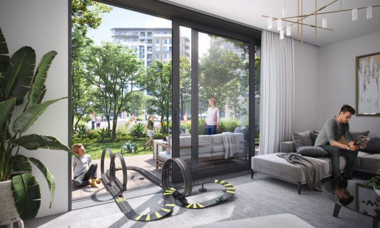 Apartments are available in 1, 2, 3, or 4-bedroom options, with choices of open or closed-plan kitchens and en-suite bathrooms. Each unit is equipped with steel exterior doors, kitchen cabinets, built-in appliances, laminated and ceramic flooring, shower cabins, PVC balcony doors, smart home systems, and central satellite TV.