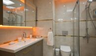 This 13-storey development is set within a secure, gated complex, featuring beautifully landscaped gardens, a children’s playground, a BBQ area, and a spacious outdoor pool. The building itself hosts a wide array of leisure and wellness facilities, including a stylish lobby, a heated indoor pool, a fully equipped fitness centre, a steam room, sauna, Turkish bath, and an indoor playroom designed for children.