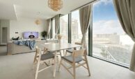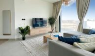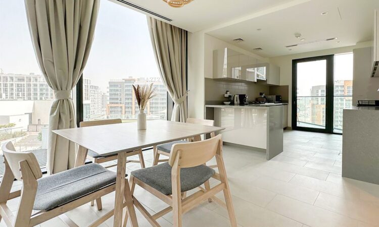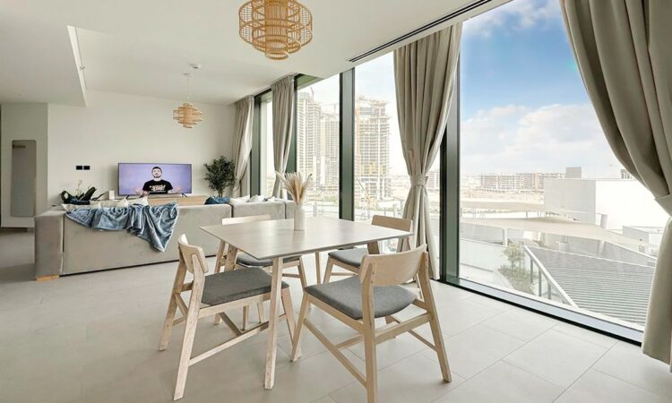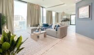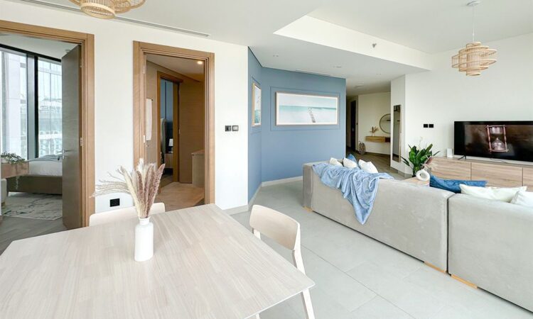 Step into this exquisite 2-bedroom apartment in Sobha Hartland Waves at Mohammed Bin Rashid City. This residence boasts a spacious layout with an open-plan living and dining area, complemented by high ceilings and full glass windows that flood the space with natural light.