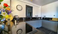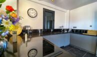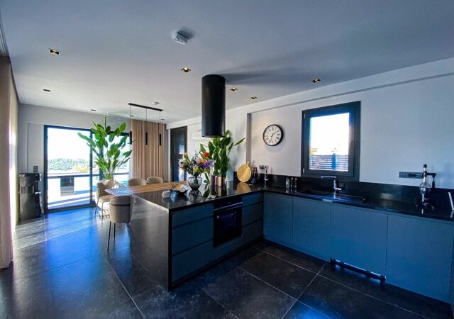 - Ground Floor: Features an open-plan kitchen crafted from high-quality natural marble, a large living room with high-quality ceramic and marble flooring, a modern fireplace, and a guest toilet.