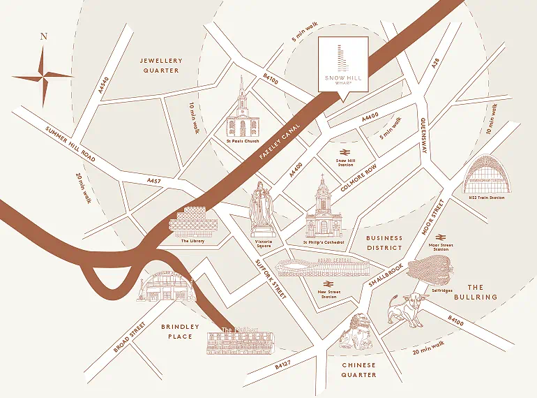 Located just 0.4 miles from Birmingham’s Colmore Business District, these 2 and 3 bedroom apartments offer both luxury and convenience. With modern interiors that maximize natural light and stunning views of the canal, these homes provide a peaceful retreat while still being close to the action of the city. Whether you work in the business district or enjoy the cultural vibrancy of Birmingham, this location places you in the heart of it all.