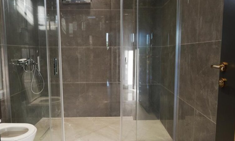 This 5-bedroom villa features a spacious living room, a separate kitchen, three bathrooms, an en-suite bathroom, a laundry room, a dressing room, a balcony, and a terrace. The villa is equipped with high-quality finishes, including a steel exterior door, PVC windows, laminate and ceramic flooring, fully fitted kitchen and bathroom cabinets, a central satellite TV system, and a modern shower cabin.