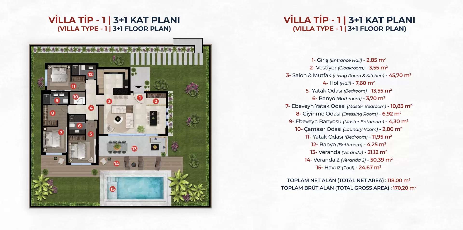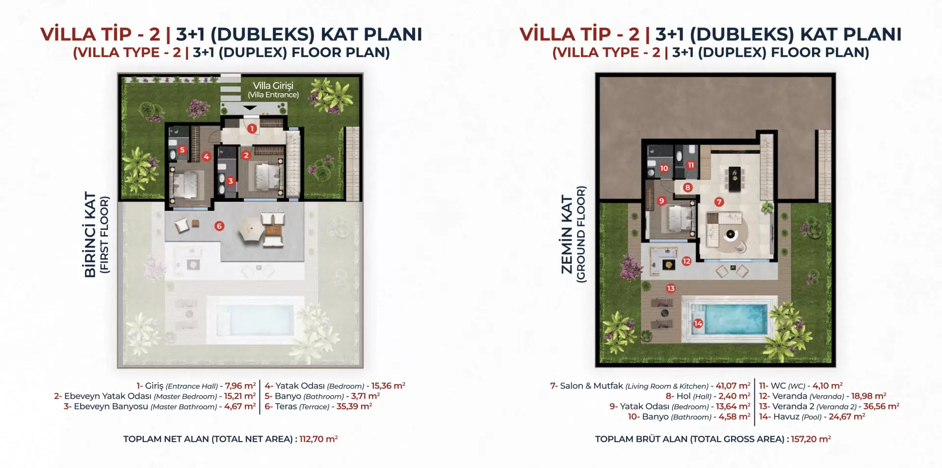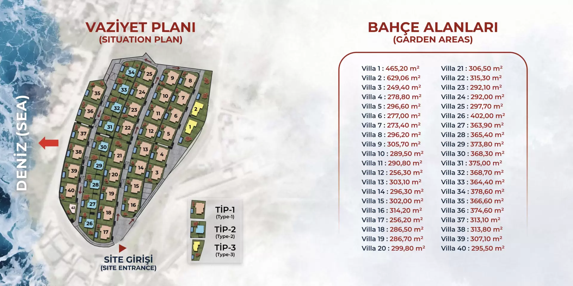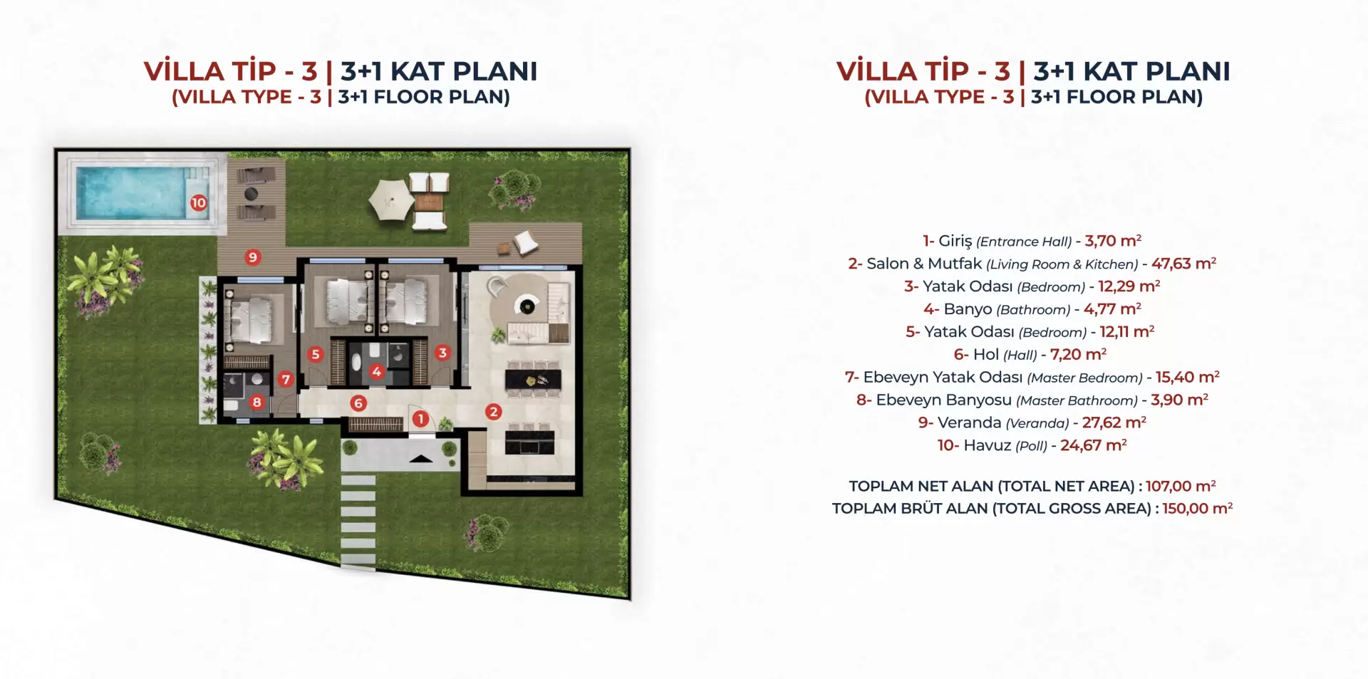 Available in single-story and duplex options, these villas offer three spacious bedrooms, a living room, an open-plan kitchen, and panoramic sea views. The interior design is completed with high-quality materials, and the villas are equipped with modern amenities such as underfloor heating and a VRF air conditioning system, making them the perfect choice for a comfortable and luxurious living experience.