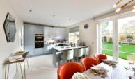 The first floor features a dedicated living room with a Juliet balcony, creating a light-filled retreat for relaxation or hosting guests. The principal bedroom includes an en-suite bathroom and a walk-in dressing area, offering a true sense of luxury. Three additional double bedrooms occupy the second floor, with one benefiting from an en-suite shower room and fitted wardrobes. A separate family bathroom serves the remaining bedrooms.
