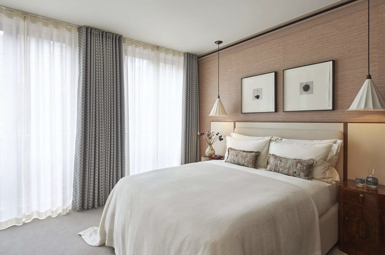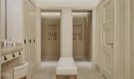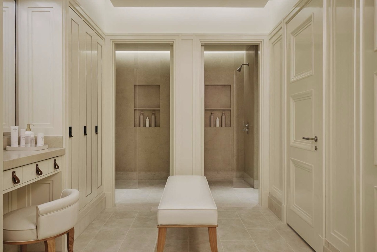 Each bedroom is conceived as a sanctuary. The principal suite offers a serene retreat with a luxurious bathroom featuring marble surfaces, a soaking tub, and a walk-in rain shower. The secondary bedrooms also feature en-suite bathrooms, spacious wardrobes, and views across the landscaped courtyard garden. Throughout the residence, fine materials such as brushed metal, natural oak, and polished marble add warmth and texture, while modern lighting and climate control systems ensure absolute comfort.