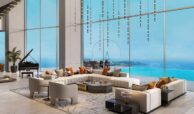 Full-height windows and spacious open-air balconies offer spectacular views of the surrounding landscape, including cityscapes, the sea, water features, parks, and verdant vegetation.